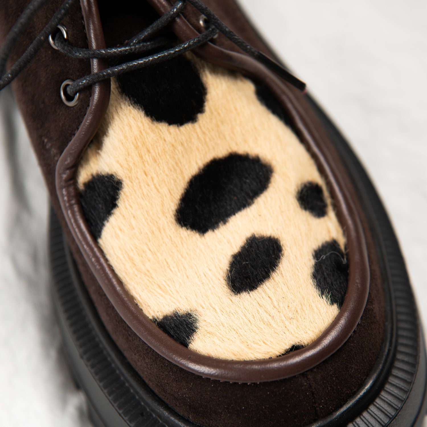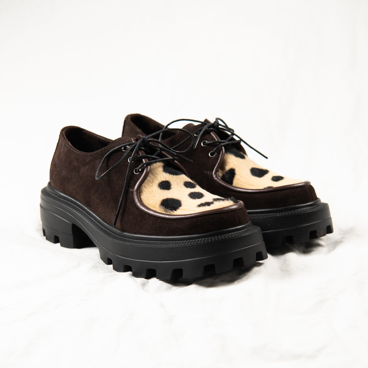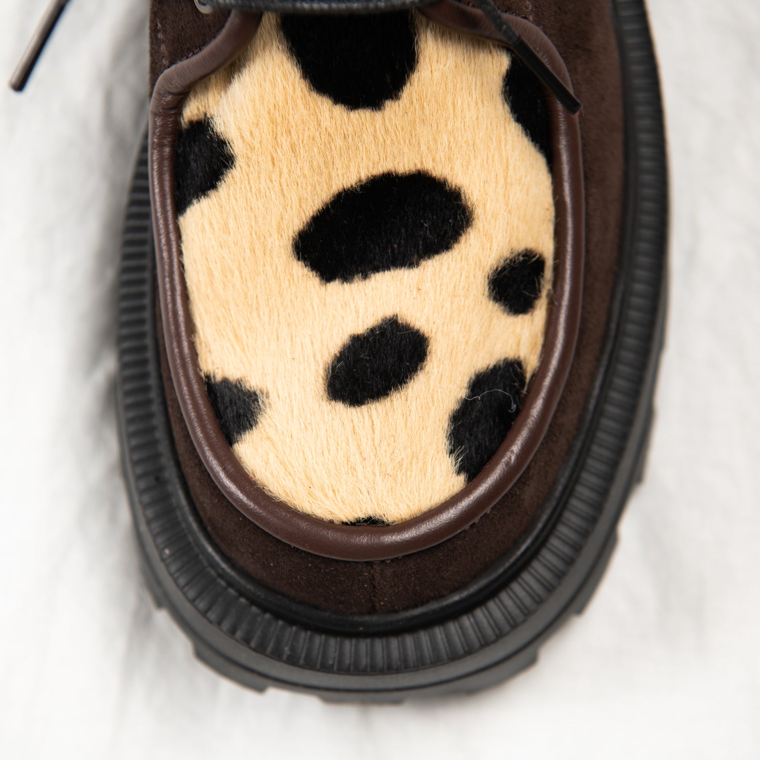 Meet Cocoa Clash — your earthy rebel with a soft touch. Crafted from deep brown suede and finished with a bold spotted-print pony hair front panel, this pair blends quiet luxury with unapologetic personality. Framed by dark chocolate piping and finished with a chunky black sole, they walk the line between classic and chaotic — and that’s exactly the point.