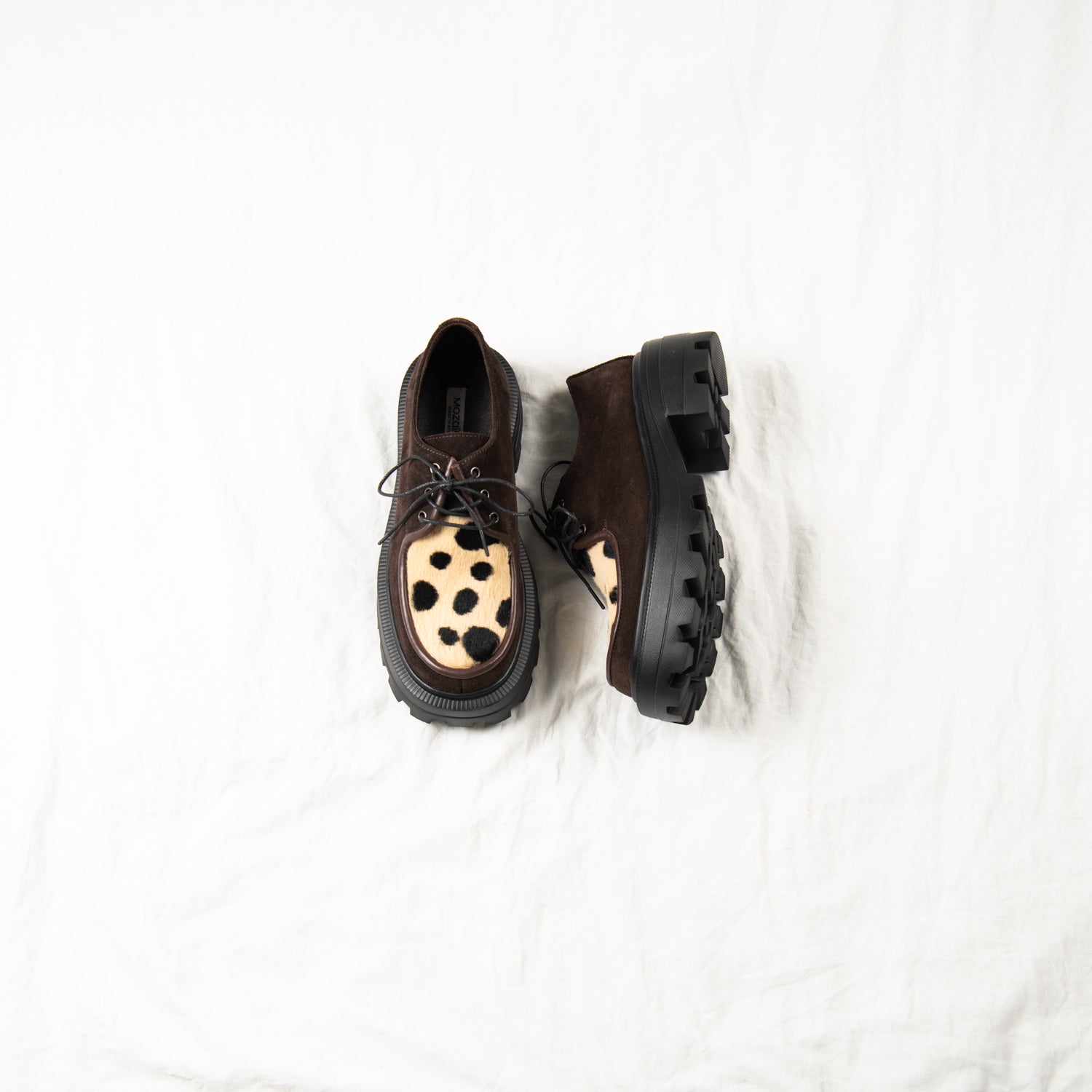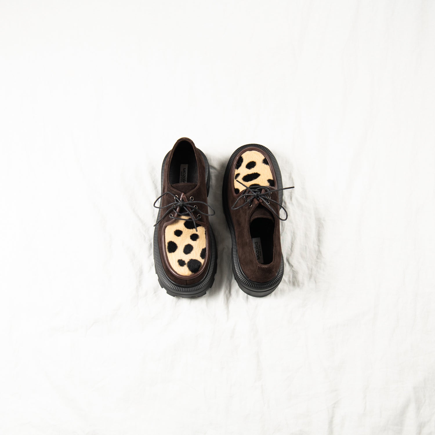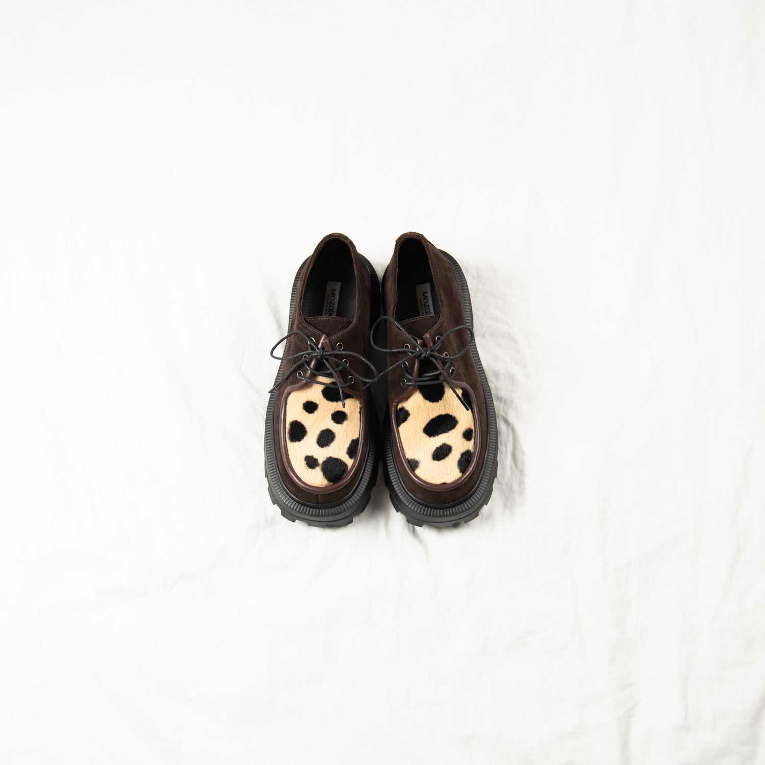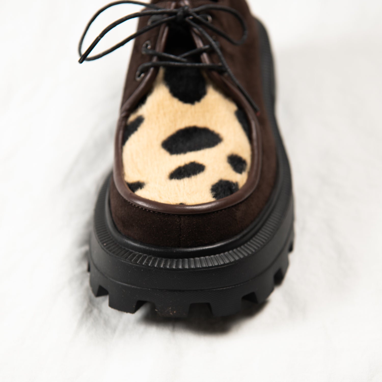 Meet Cocoa Clash — your earthy rebel with a soft touch. Crafted from deep brown suede and finished with a bold spotted-print pony hair front panel, this pair blends quiet luxury with unapologetic personality. Framed by dark chocolate piping and finished with a chunky black sole, they walk the line between classic and chaotic — and that’s exactly the point.