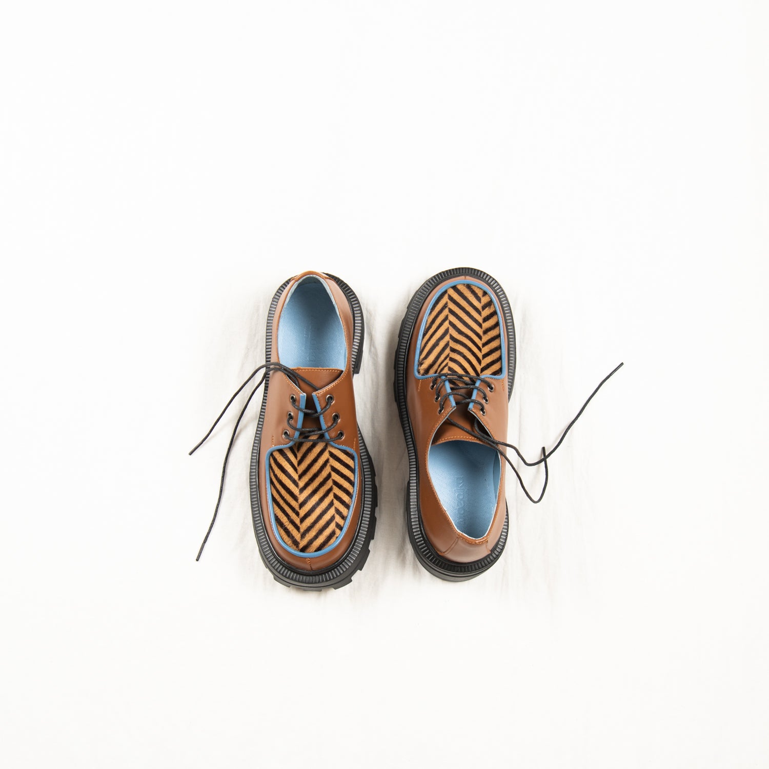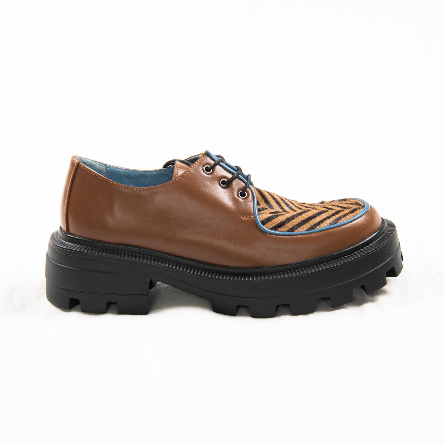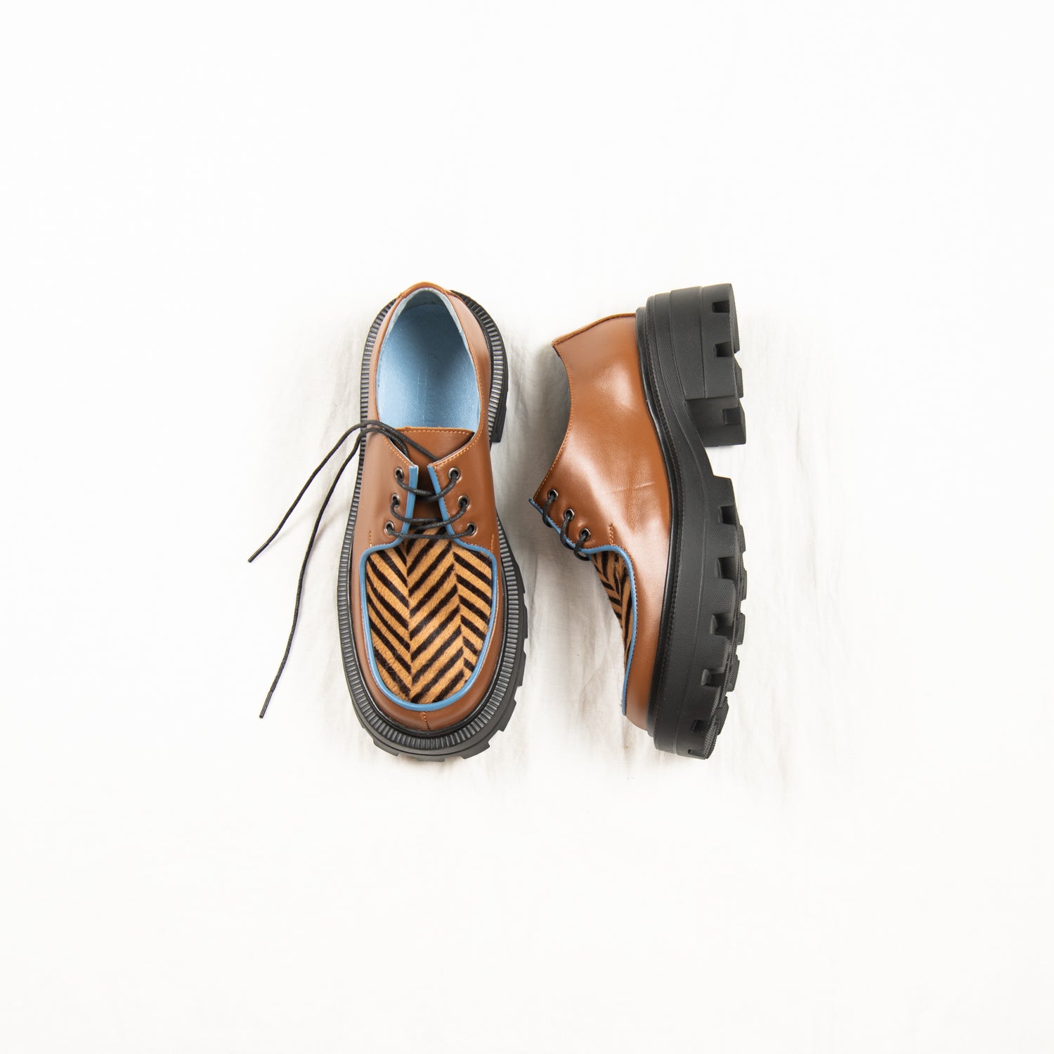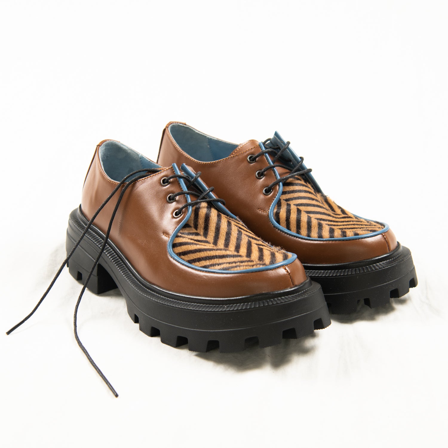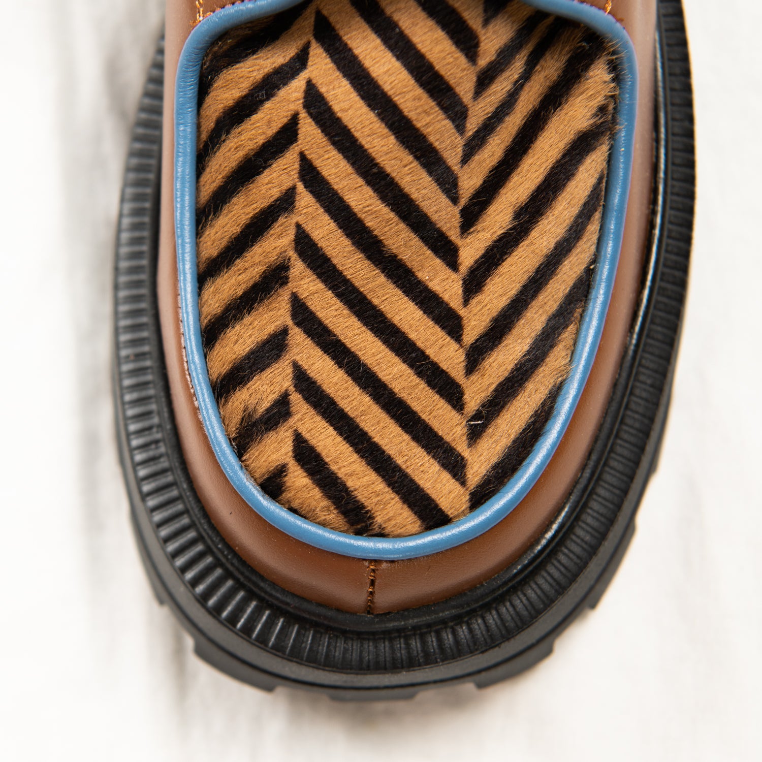 Zebra Mocha is a quiet storm — subtle in colour, wild in pattern. The vamp bursts with energy, featuring a chevron-patterned pony hair that looks like swirling espresso, while the body of the shoe wraps your foot in smooth, earthy mocha leather. Trimmed with cool pale blue piping for that icy finish and grounded on our chunky signature sole, it’s both sophisticated and feral.